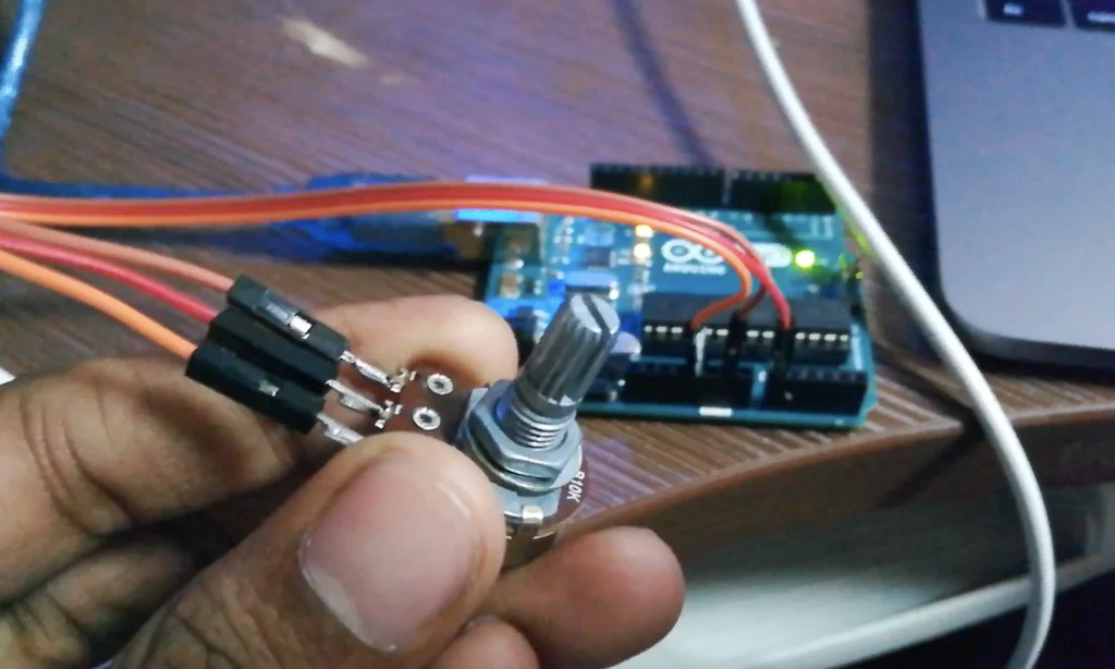 As you can see here I have connected a potentiometer to Arduino and when I rotate the knob the change in resistance will be measured by Arduino and the values will be read by our processing program and display it in the analog meter.